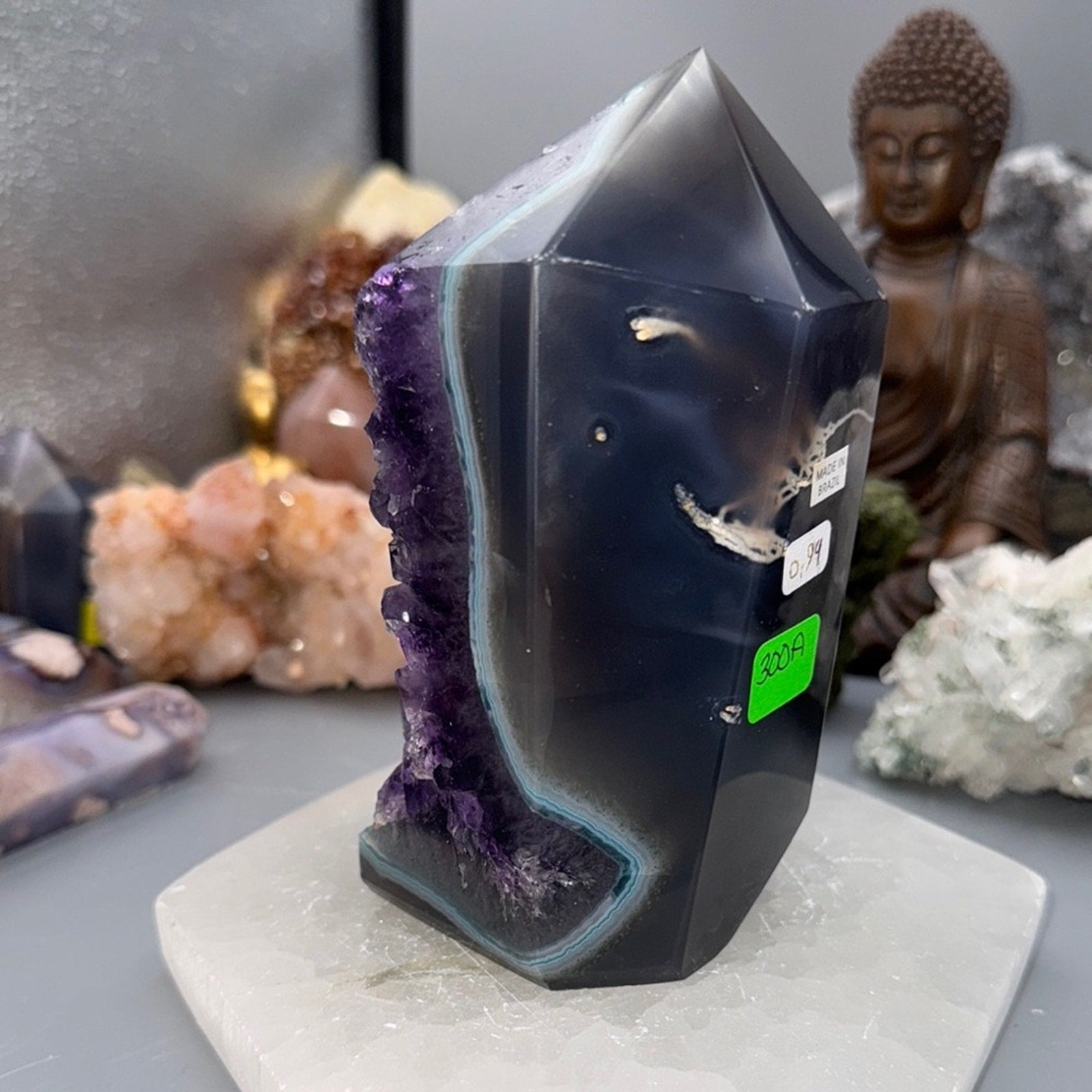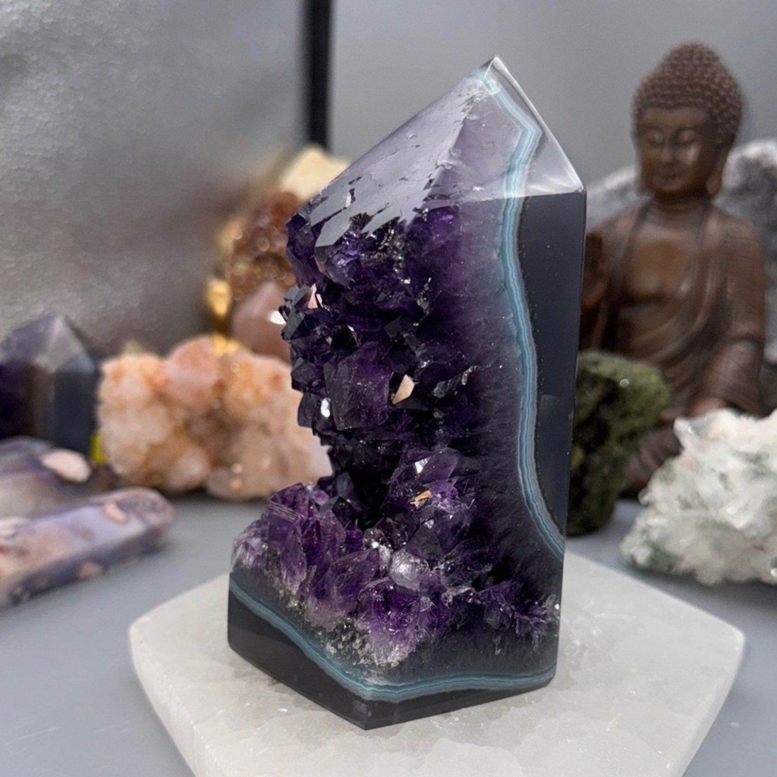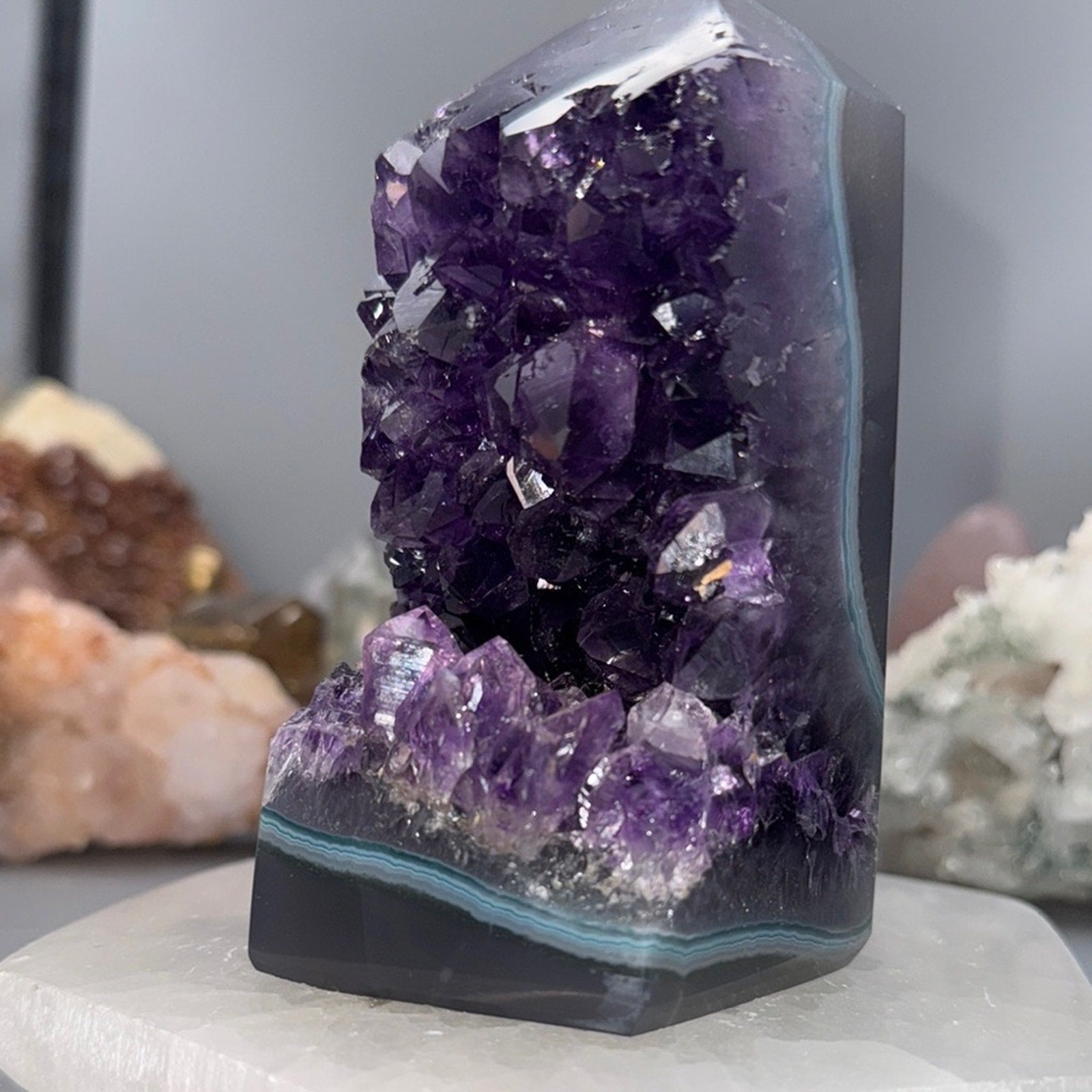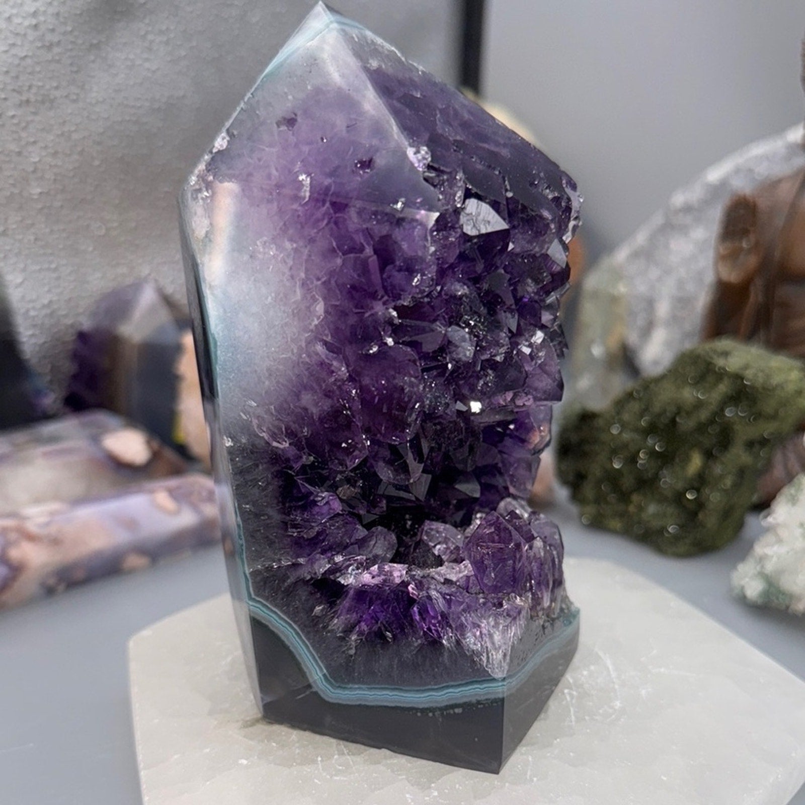 Enhance your space with this stunning amethyst crystal geode. Its deep purple hues add a touch of elegance and tranquility to any room.